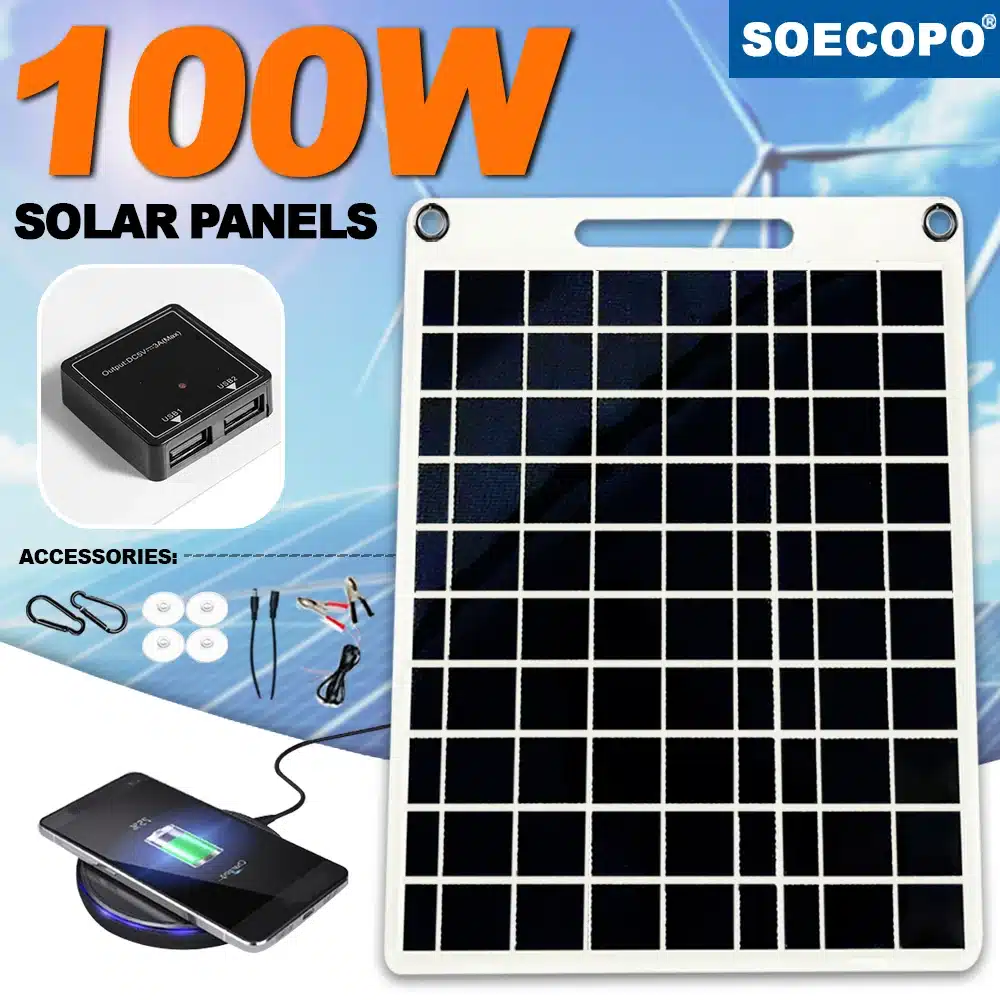 100W Solar Charger with Dual USB Ports, Waterproof & Portable Solar Panel for Outdoor Camping, Hiking, Emergency Devices