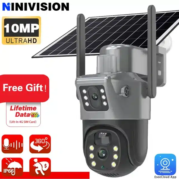 10MP 5K Free 4G Internet Traffic Card Solar Camera Dual Lens Monitor Security Protection PTZ Video Surveillance CCTV 2-Way Audio