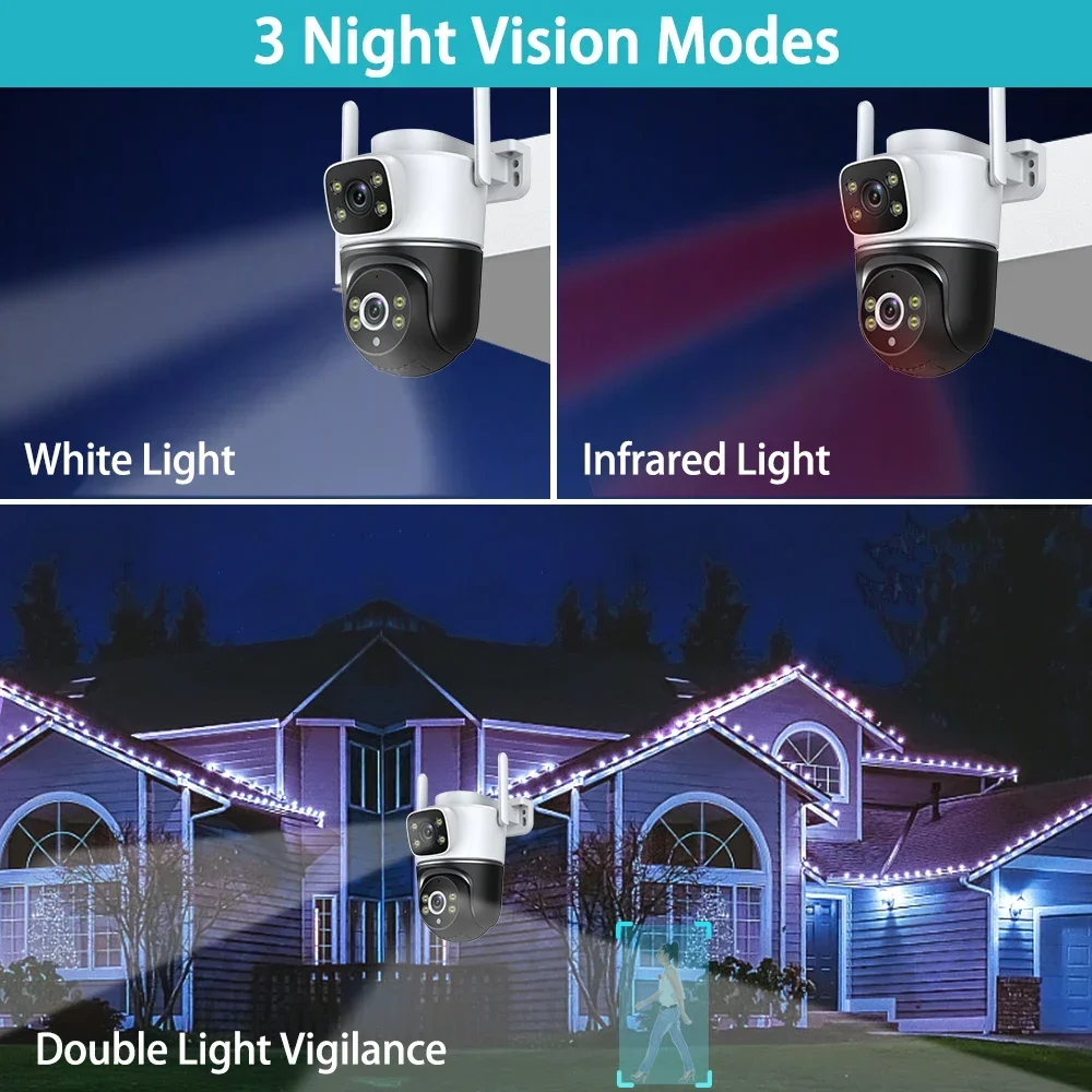 – Dual light source design, built-in infrared light + white light, night vision infrared and night vision full color can be set;