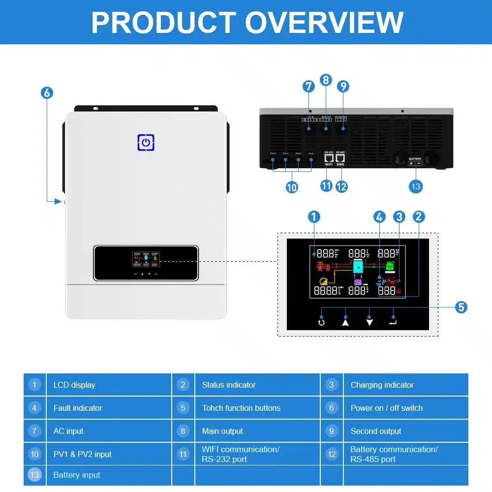 NoteThis is a wide voltage Hybrid Solar inverter, If Solar Inverter without external battery ,The voltage which starts to connect to the solar panel must be above 120V for the inverter to work normally, if with external battery 90V is working.