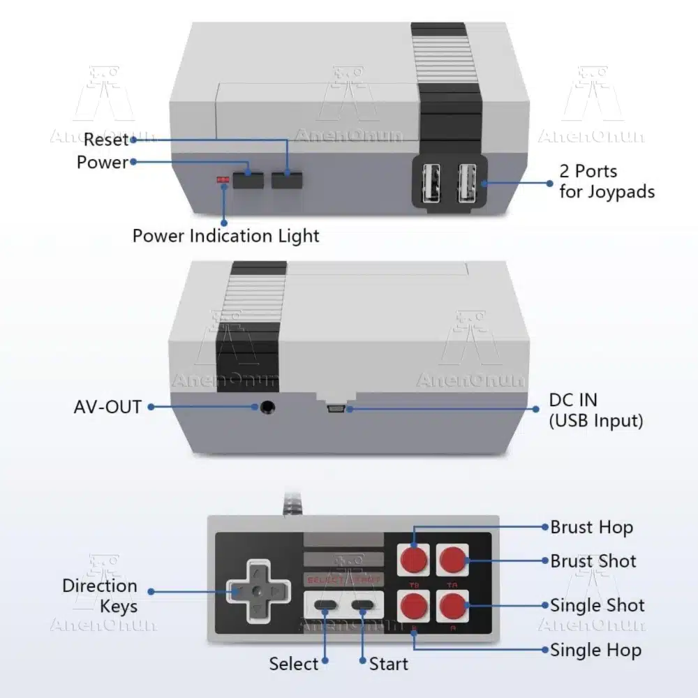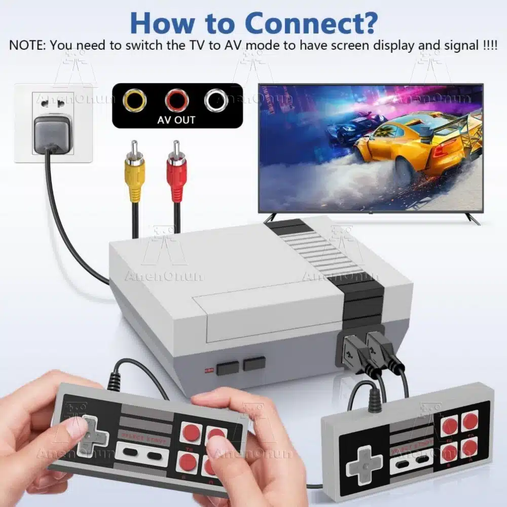 🔥🔥🔥【Plug & Play Video Game Console】 This video game console adopts an AV output method. Please ensure your TV or monitor has an AV input port for easy connection. In just a few simple steps, you can connect the game console to the power source and TV, instantly starting your gaming journey. Note: Pressing "Select + Start" simultaneously will not return to the menu. Every time you want to switch games, you must press the RESET button on the machine. While the images of these classic games on a large screen are not as clear as modern games, they remain highly stimulating and challenging!