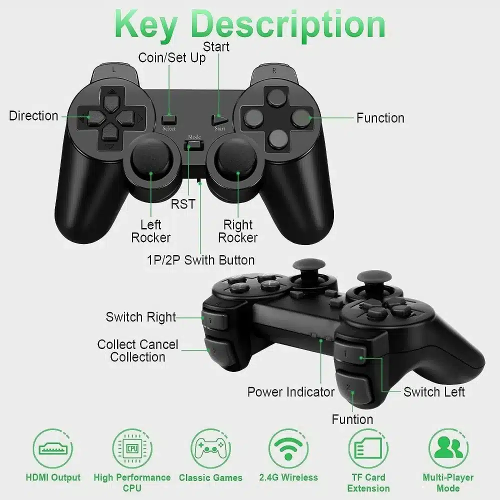 The Retro Game Stick comes equipped with dual 2.4G wireless controllers, providing you with the ultimate gaming experience without the hassle of tangled cords. With a massive 64G storage capacity, you can easily save your progress and revisit your favorite games whenever you desire.