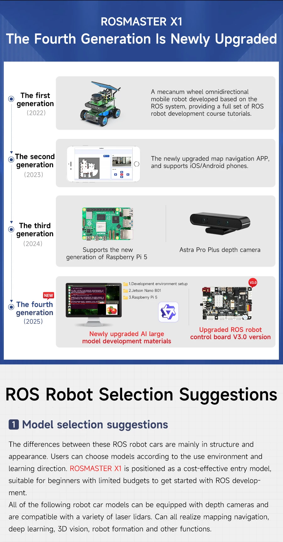 ROSMASTER X1 is a 4WD drive mobile robot with pendulous suspension chassis based on ROS robot operating system. It supports Jetson NANO and Raspberry Pi 5 development boards, and is equipped with high-performance hardware configurations such as lidar and depth camera, which can realize robot motion control, remote control communication, mapping building and navigation, following and obstacle avoidance, automatic driving, human body feature recognition and other functions. In addition, the ROSMASTER X1 also supports multiple remote control methods such as APP/handle/computer keyboard. In addition, we have provided 110 teaching videos with Chinese and English subtitles to help users quickly learn about ROS robot operating system and Python programming.